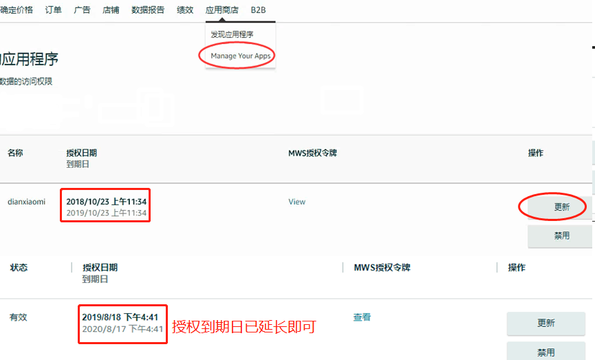 1由于亚马逊MWS授权有效期是一年,到期之前,亚马逊会通知卖家更新授权