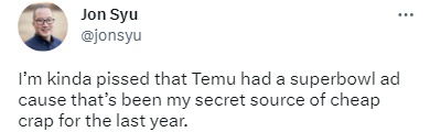 不管怎么样,Temu这次的大手笔都获得了讨论度,达到了获取流量的目的,更重要的是,通过超级碗这样一个广阔的舞台,它成功地把自己最重要的低价定位广而告之:只要价格足够低,你就可以自由购物,像亿万富翁那样无需考虑预算。
