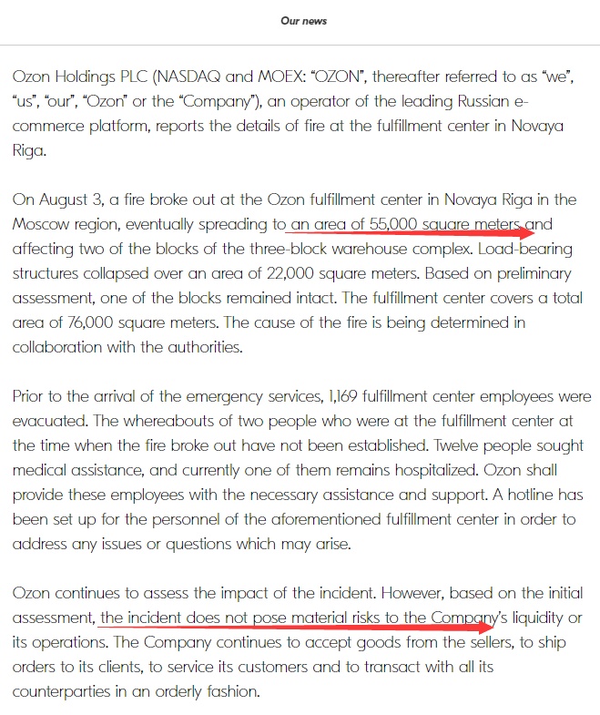 值得一提的是,8月3日,位于莫斯科州的电商平台Ozon公司的仓库起火。由于屋顶倒塌和空气瞬时进入,形成强烈对流,导致火灾迅速蔓延。