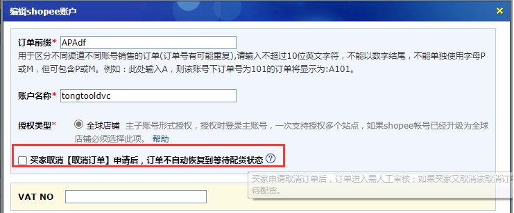基础设置>账户管理>shopee:新增“买家取消“取消订单”申请后,订单不自动恢复到等待配货状态”选项;