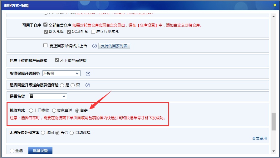 基础设置>物流设置:速卖通线上发货揽收方式增加“自寄”模式,选择自寄的包裹需要在发货管理>物流商下单填写快递单号后才能下发物流;Fedex快递的邮寄方式增加“州省转换为二字码上传”选项、增加上传订单号选项,勾选后下发物流商的包裹会在面单上打印订单号;